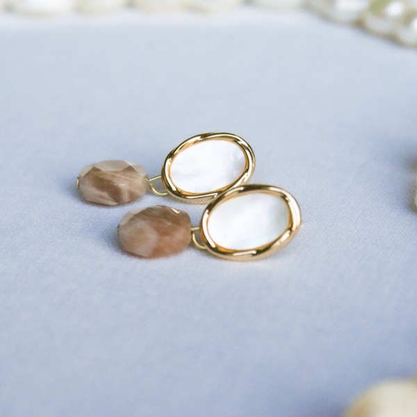 Ovaalvormige parelmoerknop met gouden randje. Rond natuurstenen hangertje in beige/zalmrozige kleur. De knop is goldplated.
