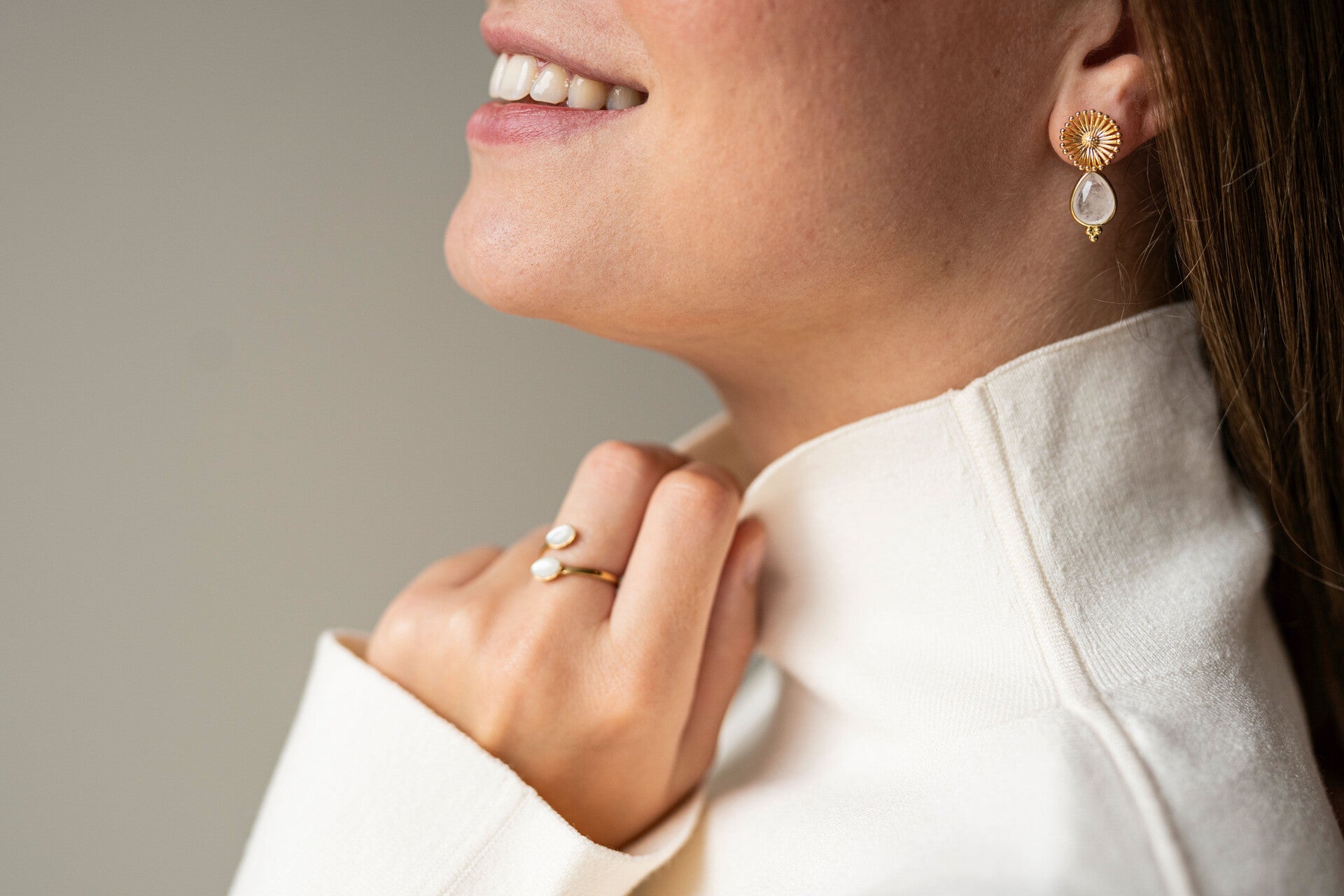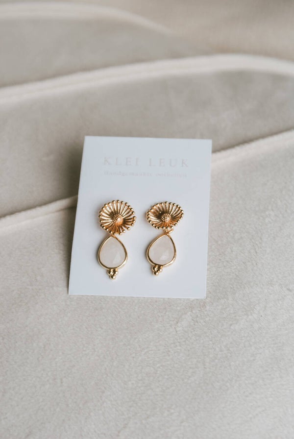 Dit prachtige oorbelset is van goldplated materiaal. De steen is van natuursteen omlijst met een gouden lijn.