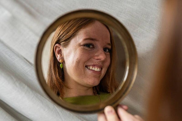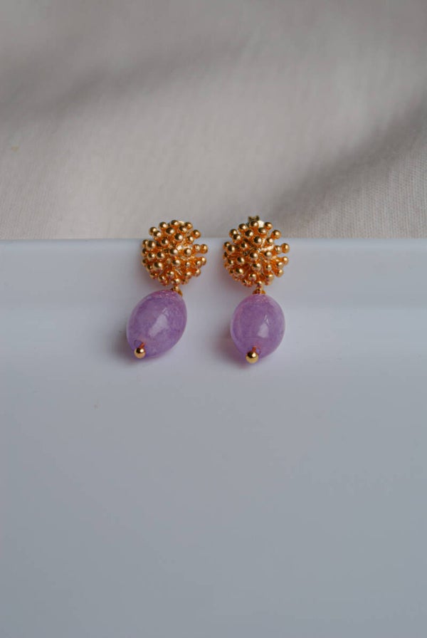 Verguld stekelknopje in bolvorm. Met lichtgewichte hanger in de kleuren: groen, lichtblauw, roze en lila.