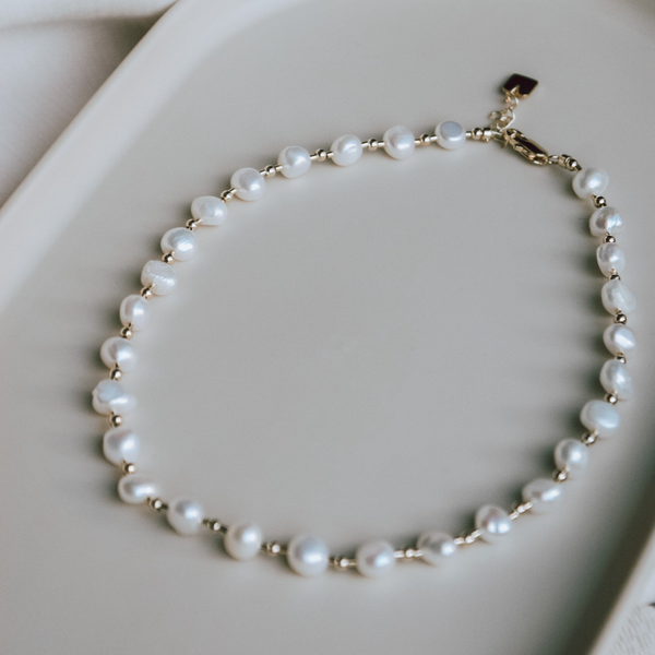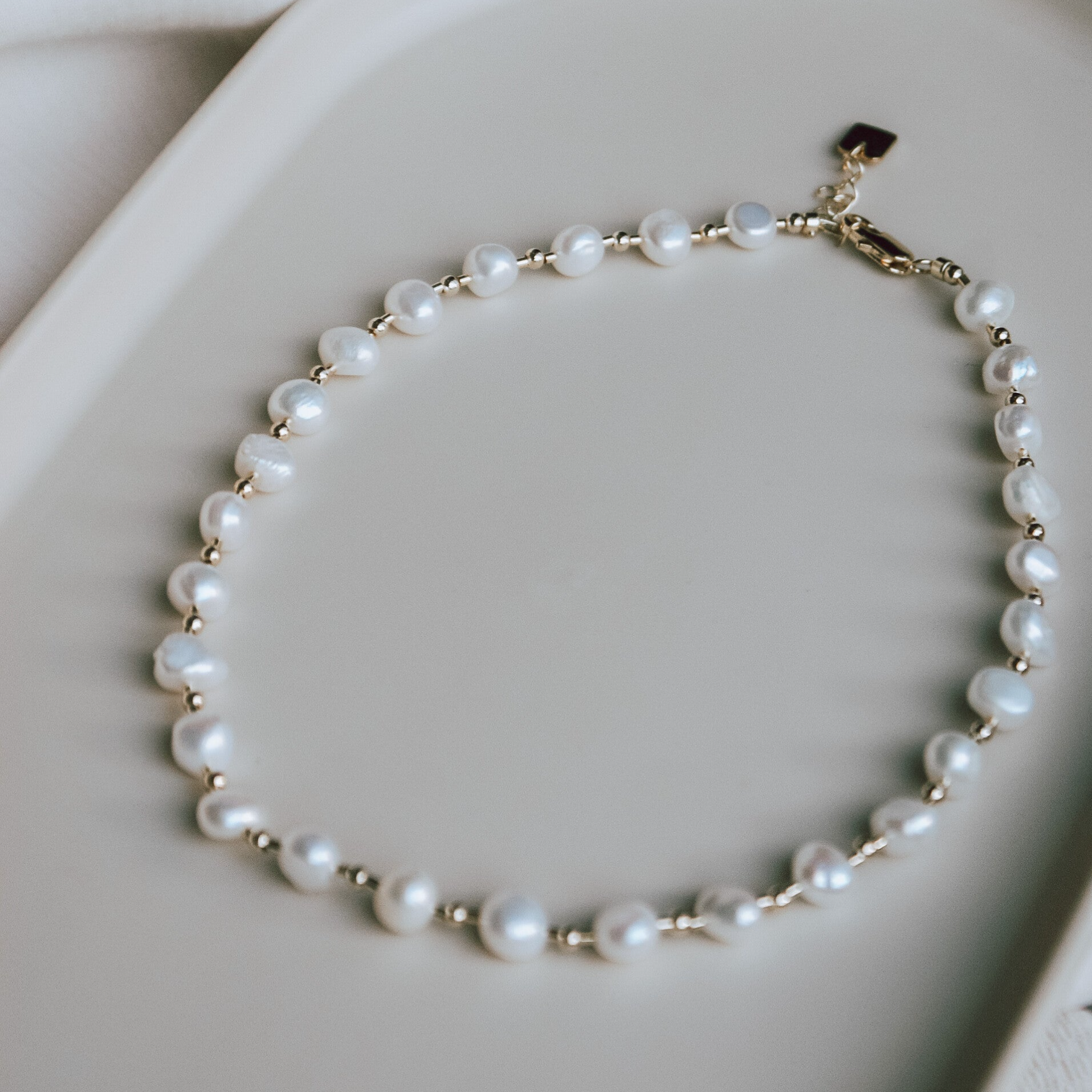 Klassiek parelsnoer met verfijnde gouden tussenstukjes.