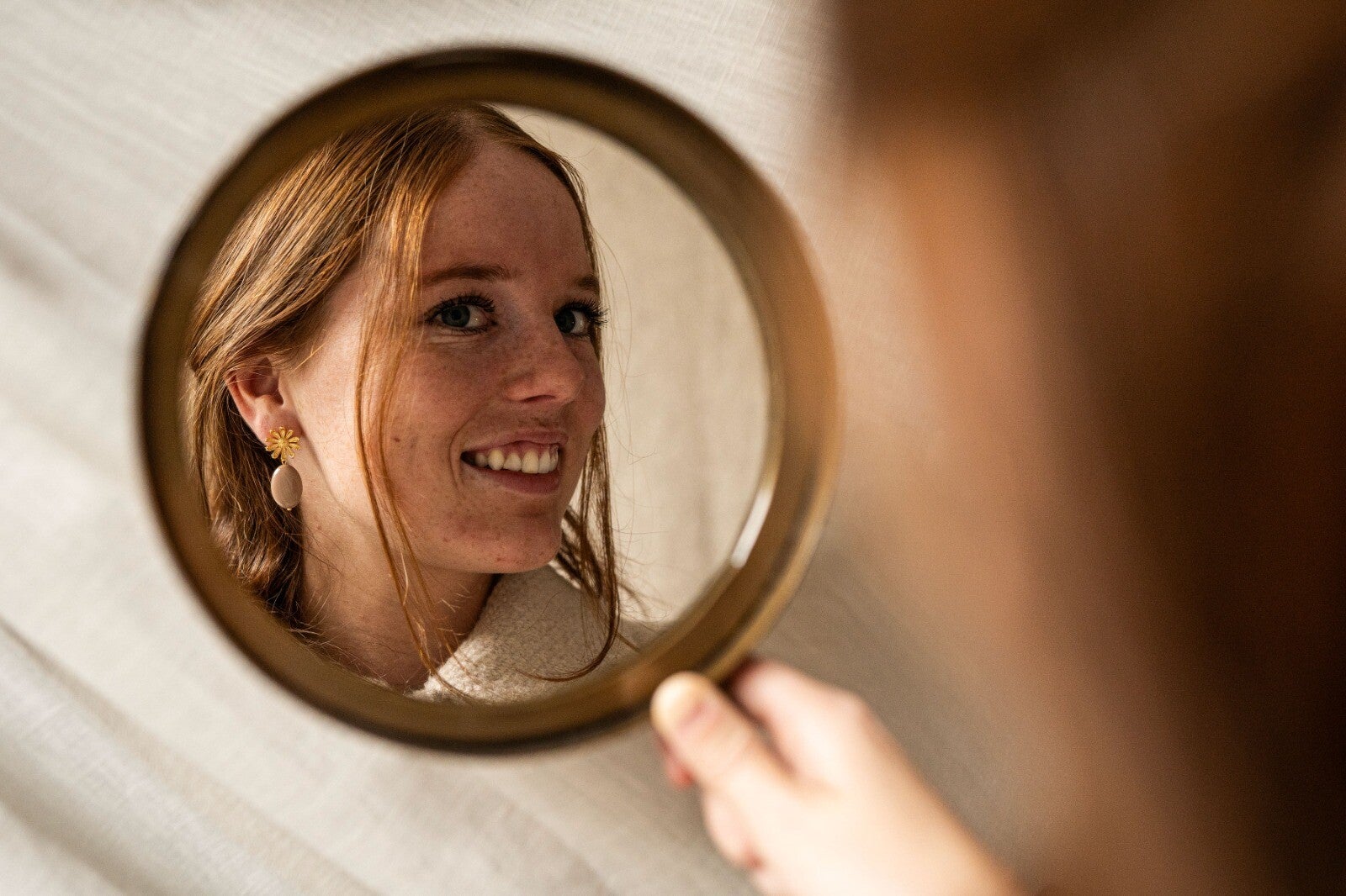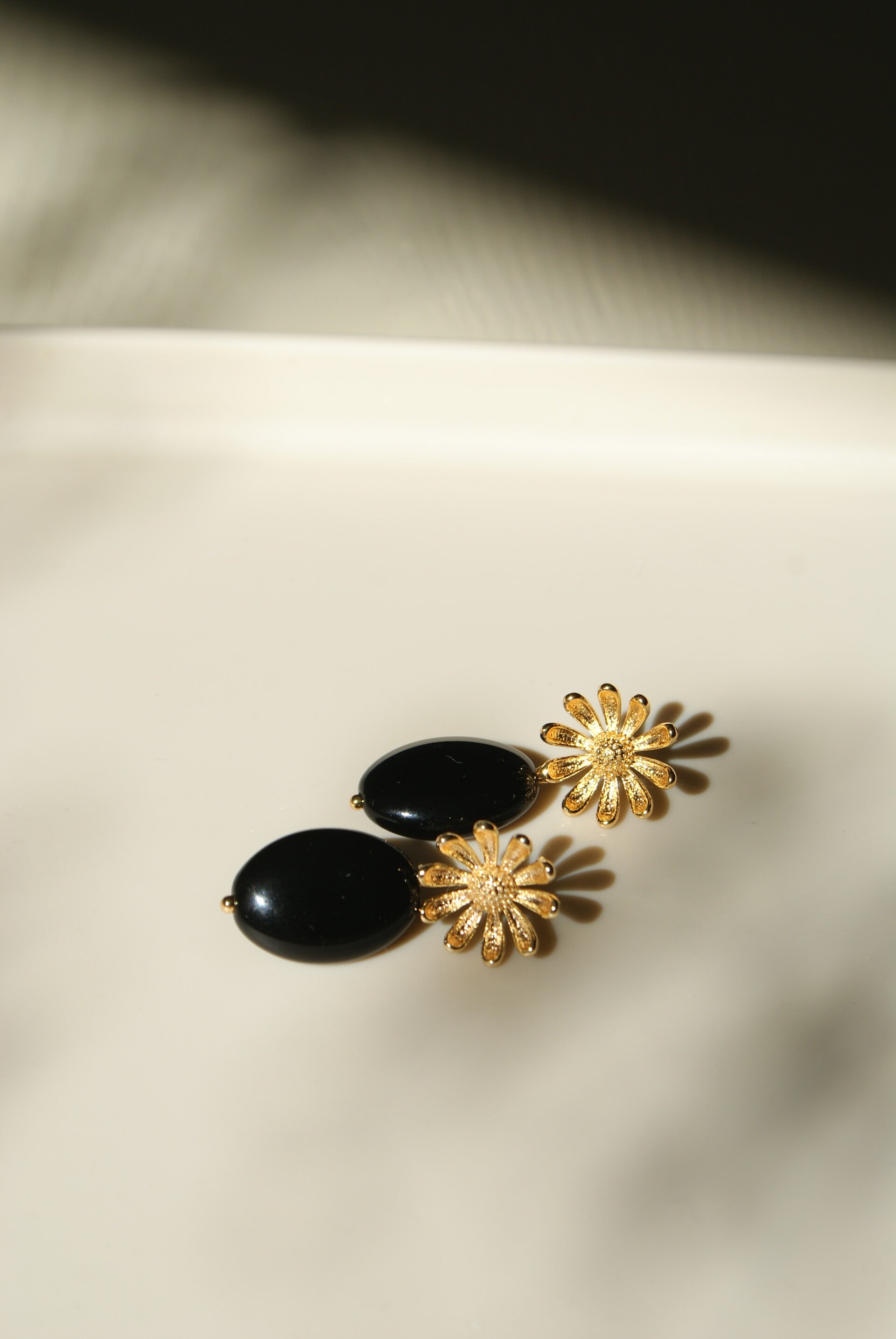 Vergulde knop in bloemvorm met lichtgewicht hanger in zwart of lichtbruin.