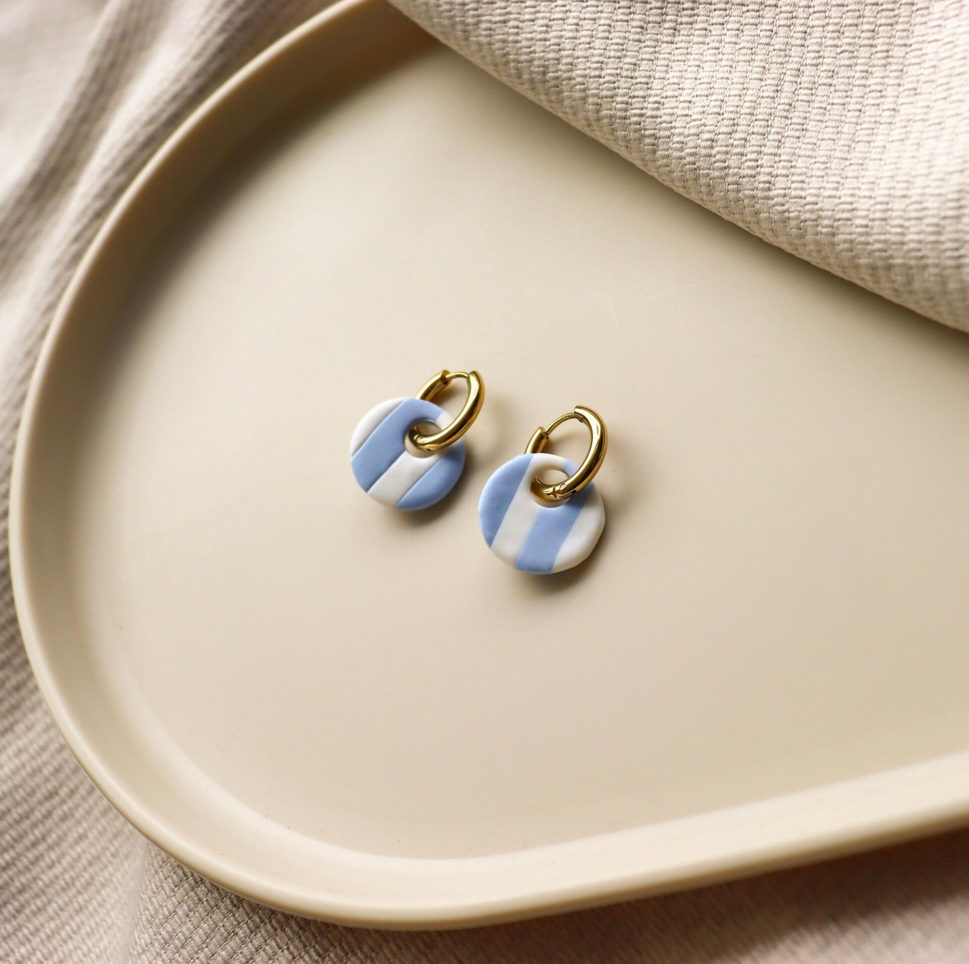 Goedkleurig ringetje met blauw/wit hangertje van klei.
