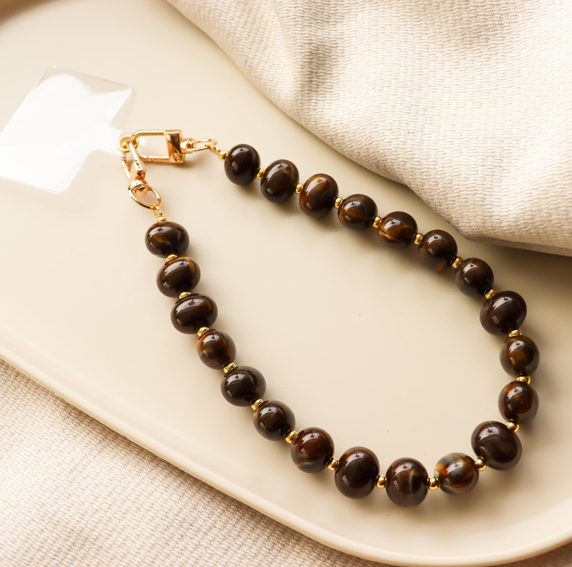 Telefoonkoord met bruine en goedkleurige kraaltjes.