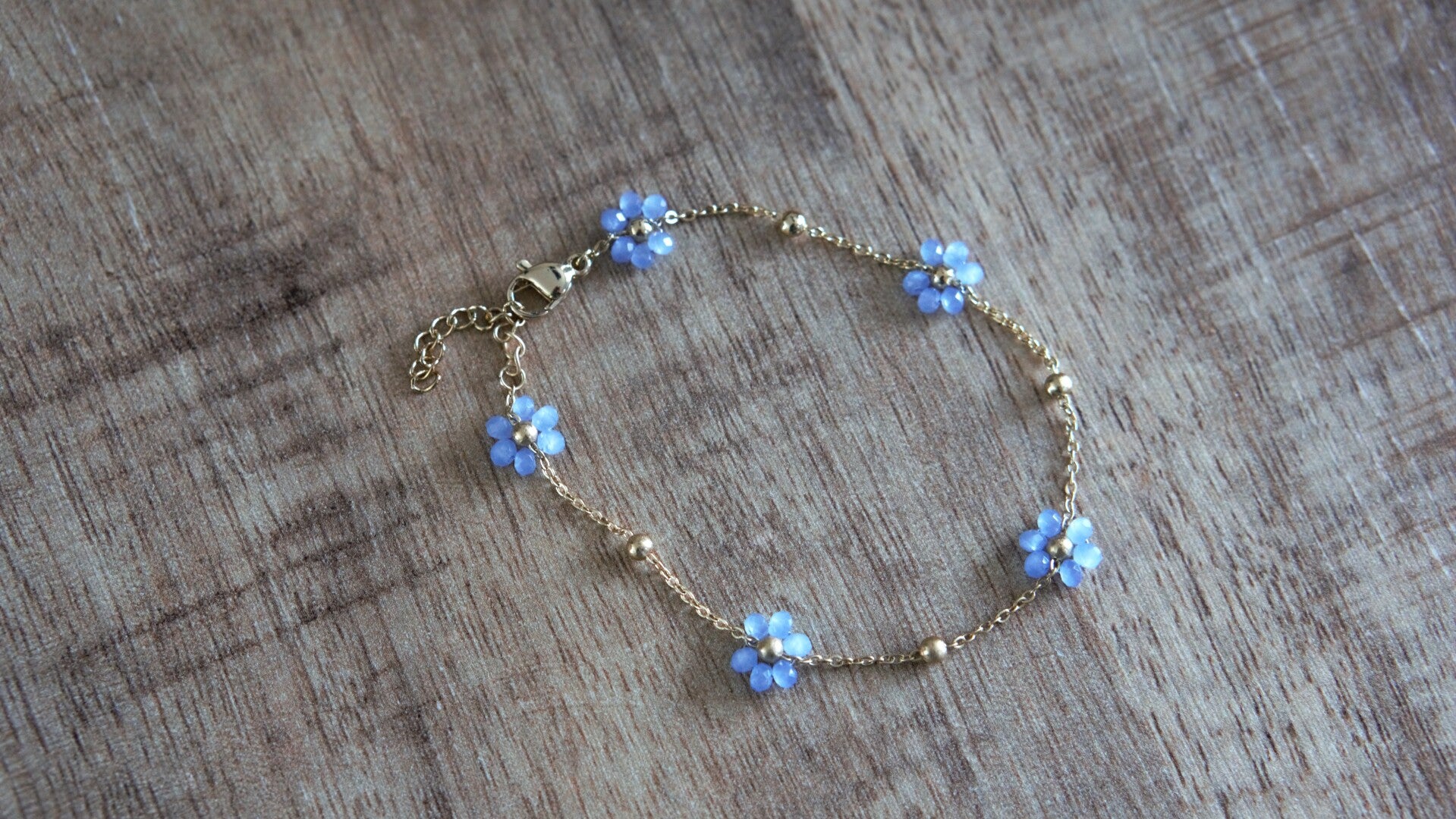 Armband met kralenbloemetjes. Keuze uit lichtblauw of groen.